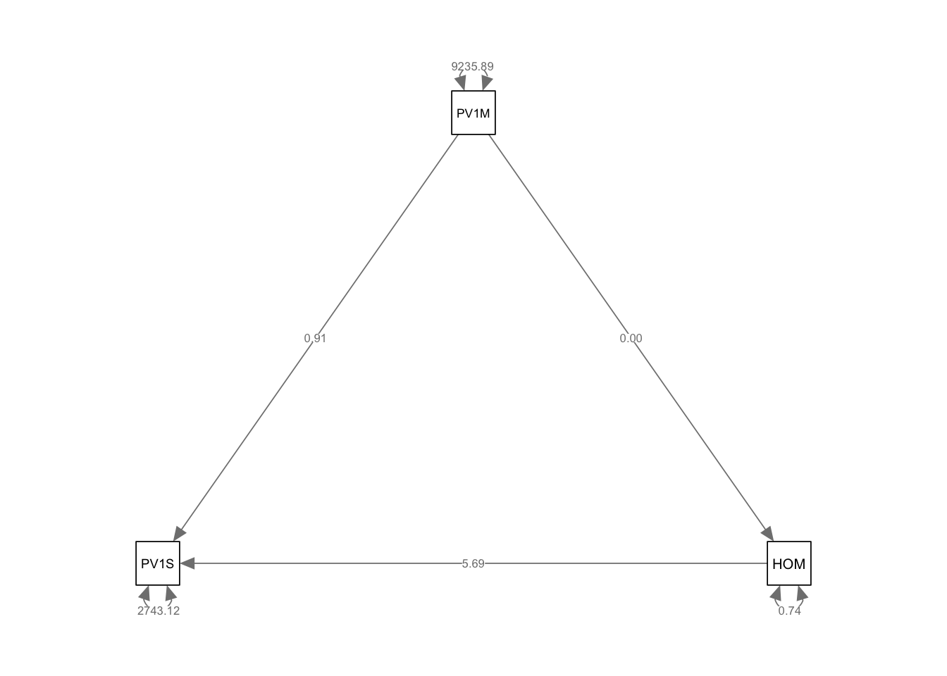 # Create a data frame for UK science scores, with the variables we need# For the model: Math, science, reading and wealth (HOMEPOS)UK_Sci_data <- PISA_2022 %>%select(CNT, HOMEPOS, PV1READ, PV1SCIE, PV1MATH) %>%filter(CNT =="United Kingdom")# Scale the the test scores so they are similar to the already scaled# HOMEPOS score (i.e. have a mean of 0 and a sd of 1)UK_Sci_data <- UK_Sci_data %>%mutate(PV1MATH =scale(PV1MATH),PV1SCIE =scale(PV1SCIE),PV1READ =scale(PV1READ))model<-"PV1SCIE ~ HOMEPOS + PV1MATH + PV1READ"fit<-sem(model, data = UK_Sci_data, estimator ="MLR")summary(fit)semPaths(fit, whatLabels ="Estimate")# Science is most influenced by mathematics scores in this model (factor loading = 0.66), following# by a smaller impact of reading (0.25). When the two academic scores are taken into account# wealth (HOMEPOS) doesn't exert a large influence on science scores. The relatively high covariance# between reading and mathematics scores (0.81) suggests this is not a great model. The residual term # variance of 23.9% suggests that a significant portion of the variance in science scores is unexplained by the model.