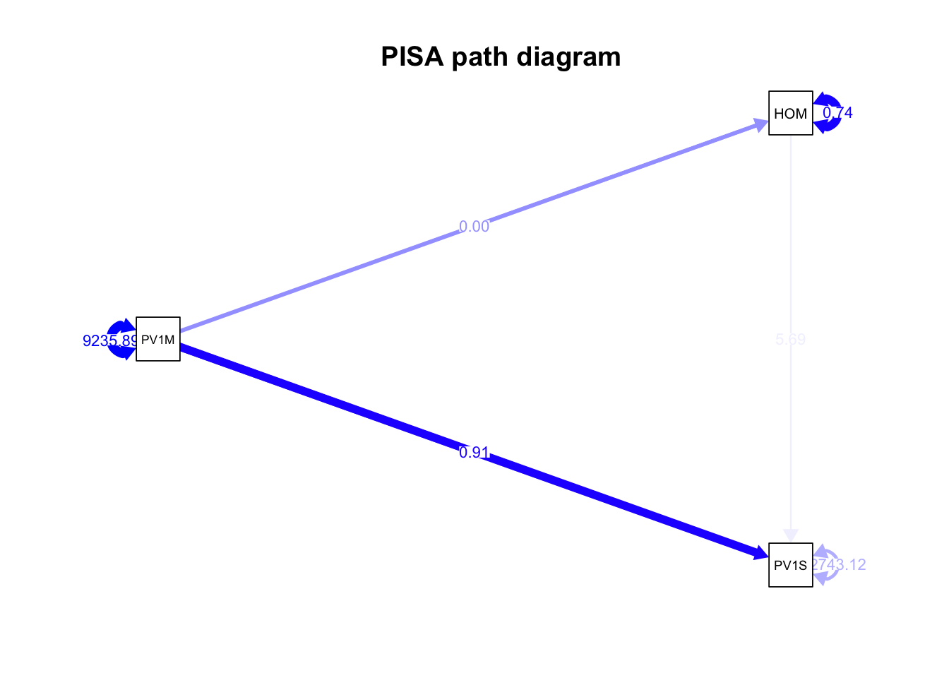 Try to create an SEM for science score in the UK. Let us assume that the variables theory suggest you include in your model are ability at mathematics and reading (PV1MATH and PV1READ) and wealth (HOMEPOS). Build a simple model in which those three variables have a direct relationship to science score, but don’t influence each other. Describe what your model suggests about the relationship between the variables.
