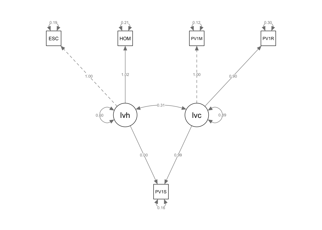 # Report the modelmodel2<-"lvh =~ ESCS + HOMEPOS lvc =~ PV1MATH + PV1READ PV1SCIE ~ lvh + lvc ESCS ~~ PV1READ HOMEPOS ~~ PV1MATH"# Fit the modelfit<-sem(model2, data = UKdata) # Extract loadingsstandardizedsolution(fit)
