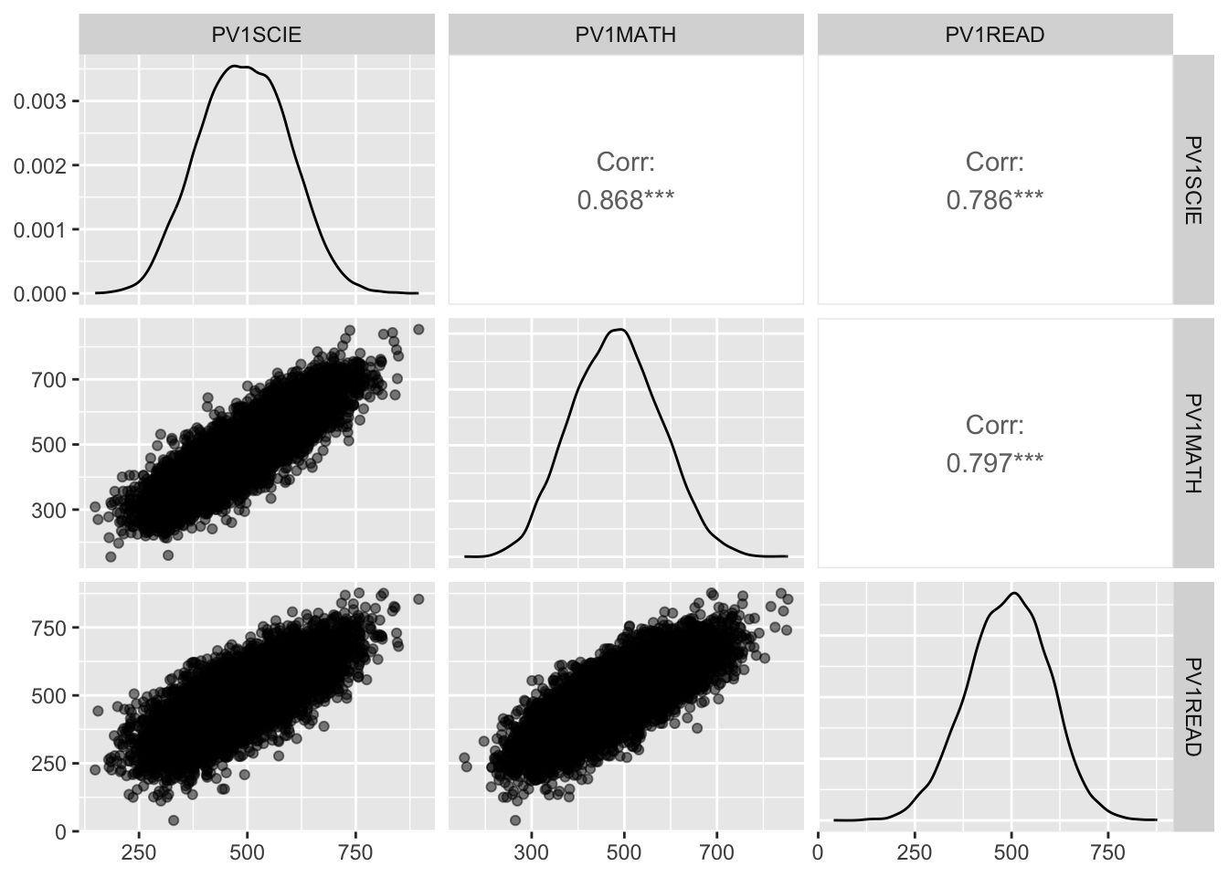 # Create a scatterplot matrix to check for linearitylibrary(GGally)1ggpairs(UKdata %>%select(PV1SCIE, PV1MATH, PV1READ),2lower =list(continuous =wrap("points", alpha =0.5)))