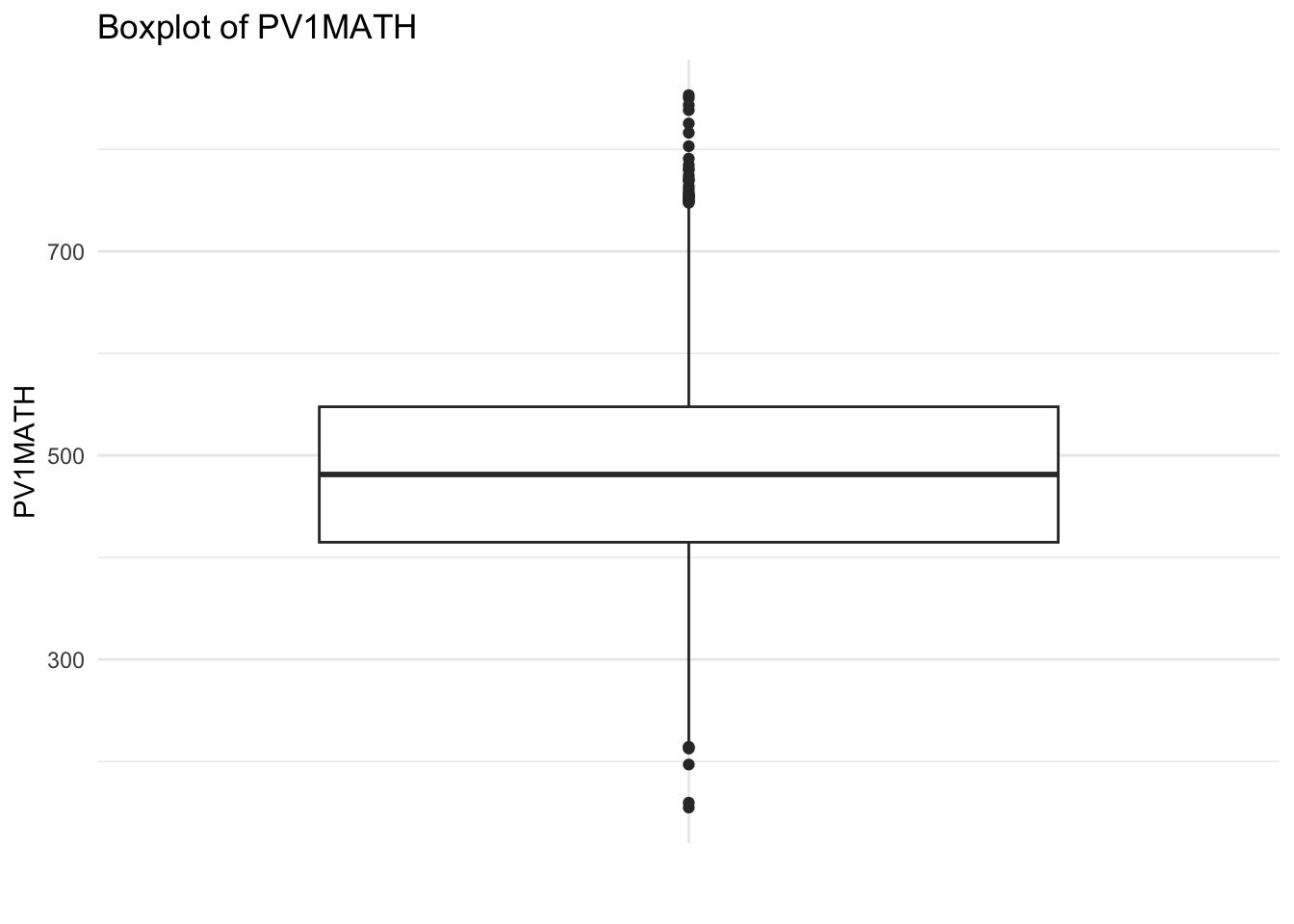 # Create boxplots to check for outliersggplot(UKdata, aes(x ="", y = PV1MATH)) +geom_boxplot() +labs(title ="Boxplot of PV1MATH", x ="", y ="PV1MATH") +theme_minimal()