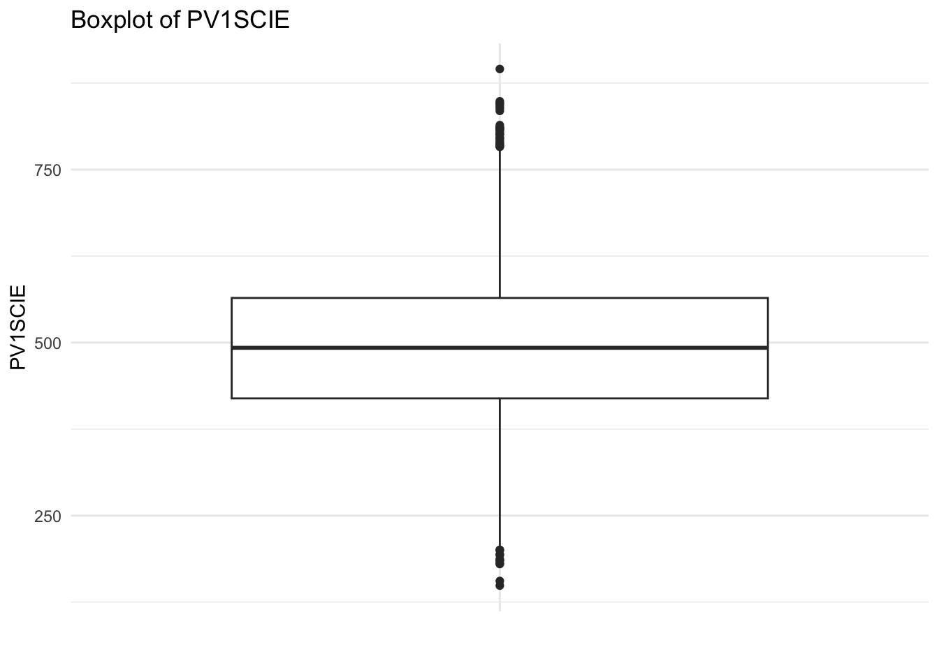 ggplot(UKdata, aes(x ="", y = PV1SCIE)) +geom_boxplot() +labs(title ="Boxplot of PV1SCIE", x ="", y ="PV1SCIE") +theme_minimal()