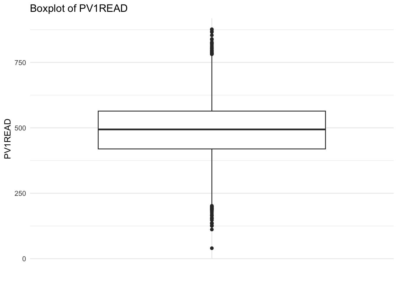 ggplot(UKdata, aes(x ="", y = PV1READ)) +geom_boxplot() +labs(title ="Boxplot of PV1READ", x ="", y ="PV1READ") +theme_minimal()