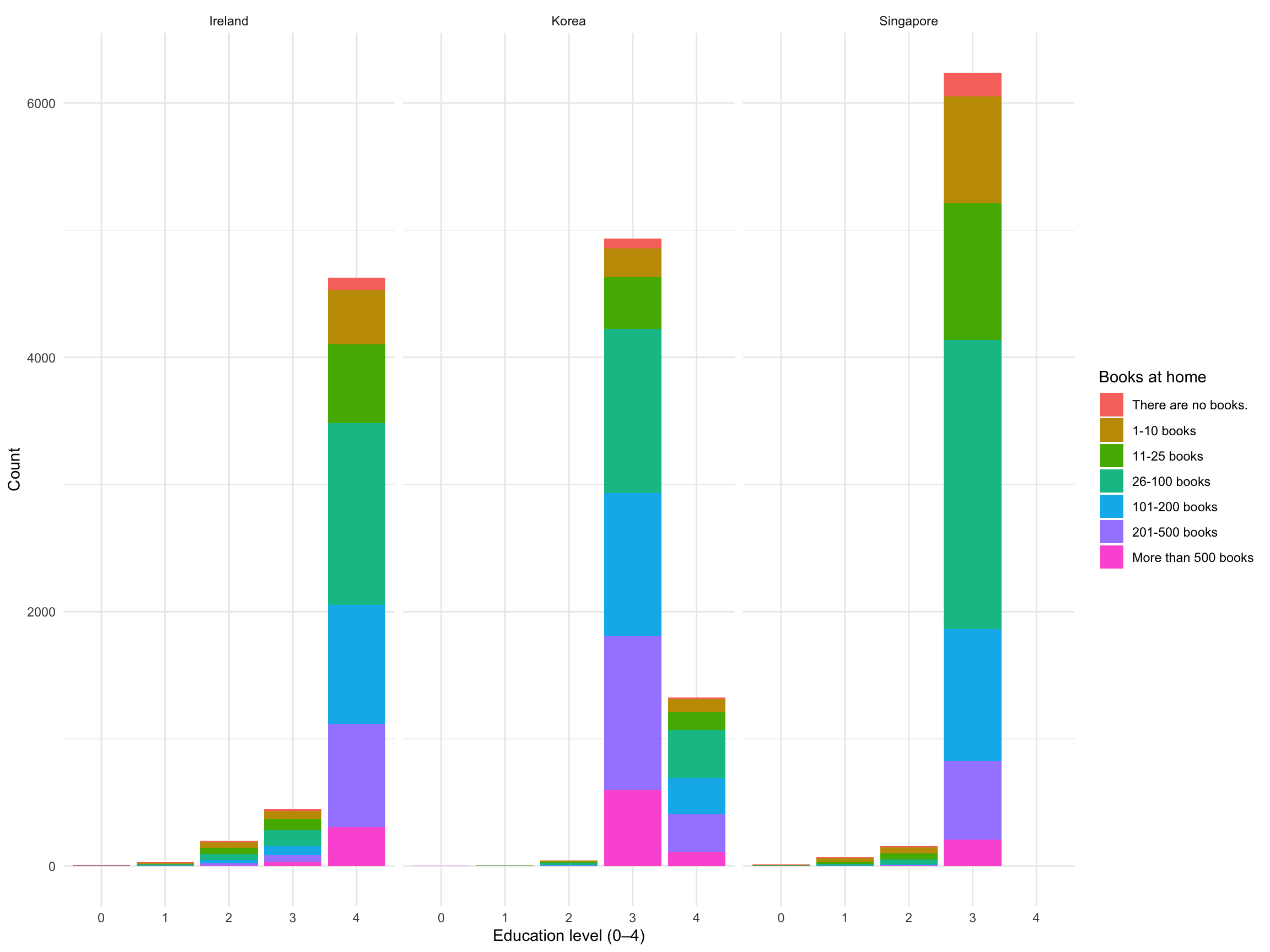 labs(x = "Education level (0–4)", y = "Count", fill = "Books at home") +