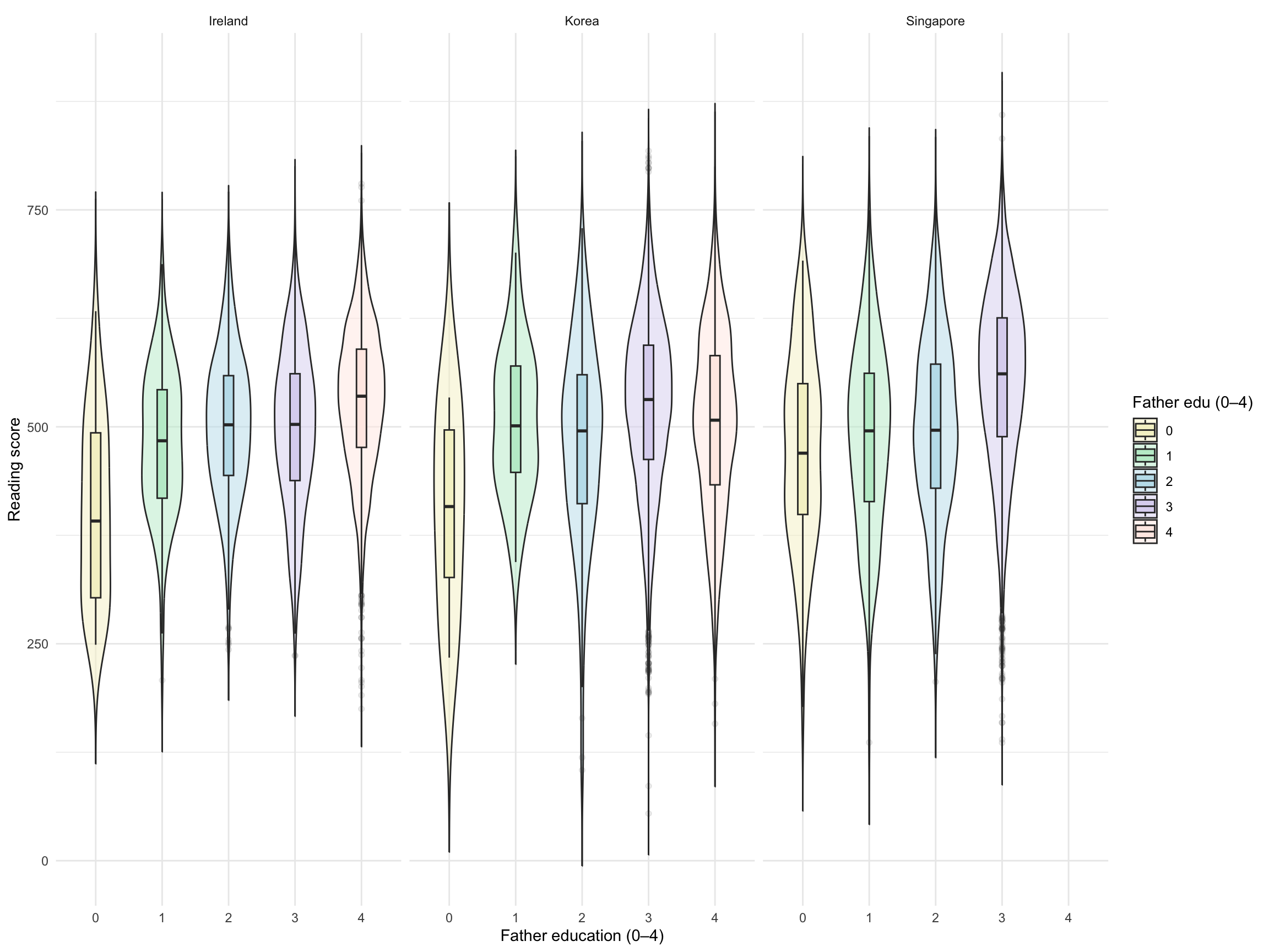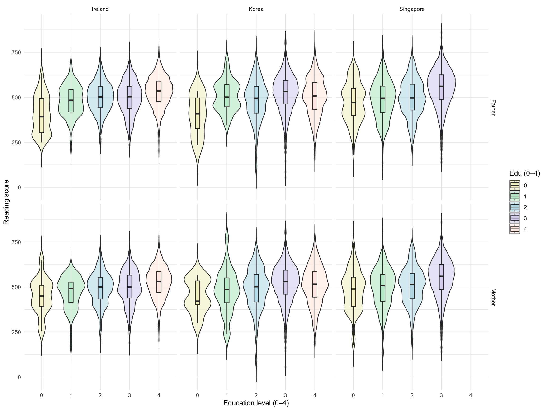 To make parental education easier to compare, I recoded both maternal and paternal education into a five-category scale, ranging from 0 (“did not complete ISCED level 1”) to 4 (“ISCED level 3.4”). Figure 1 presents mothers’ and fathers’ education separately for Ireland, Korea, and Singapore. Across all three countries, higher parental education is generally associated with higher reading scores. Showing fathers and mothers separately is useful because it highlights whether the relationship follows a similar pattern for each parent, while also allowing for clearer cross-country comparison.